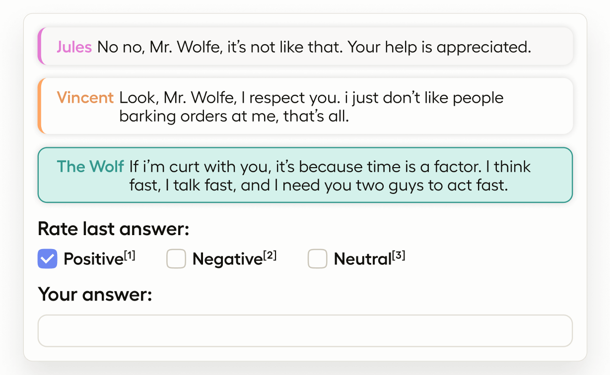 Use the Choices control tag in combination with the Choice tag to have annotators classify the dialogue response. Use the arguments to control how the choices appear on the interface:
